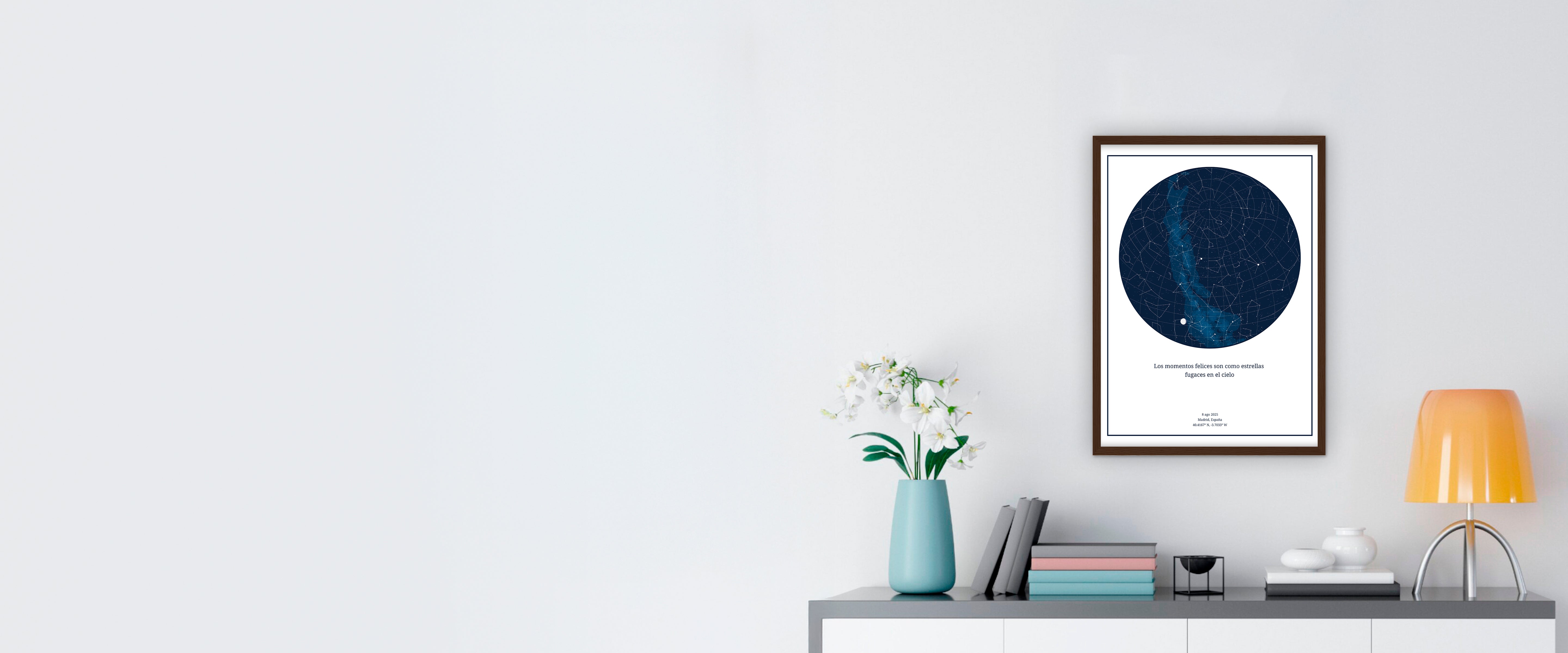 Nuestros mapas estelares pueden imprimirse en una variedad de superficies. Elige entre orientación vertical, cuadrada u horizontal en cuatro tamaños diferentes. Personaliza tu diseño añadiendo o quitando elementos como la Luna, la Vía Láctea, el mapa de constelaciones, la retícula y tu mensaje personalizado. Con cuatro colores, cuatro temas y cuatro estilos de diseño únicos, puedes crear un mapa único.